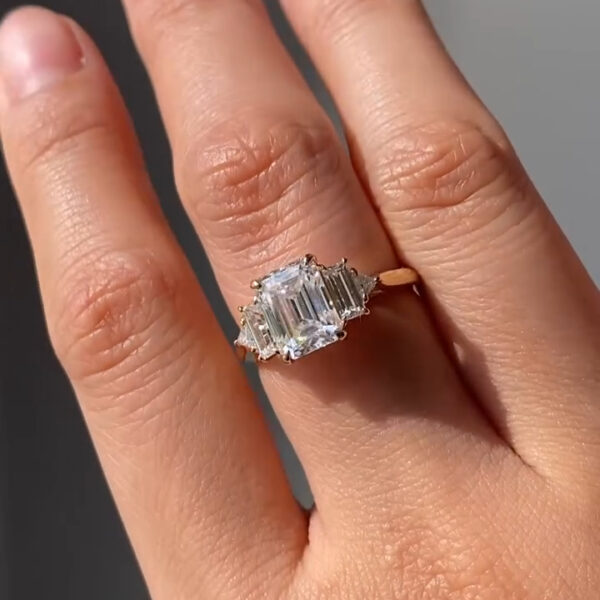 • A direct overhead shot of a breathtaking three-stone engagement ring. The focal point is a large emerald-cut gem, exhibiting the clarity and step-cut faceting characteristic of a premium moissanite diamond. Flanked by trapezoid side stones leading to a yellow gold band, the design mimics the sophistication of a high-carat lab grown diamond piece. The lighting emphasizes the hall-of-mirrors effect in the center stone, creating a visual perfect for attracting luxury buyers.