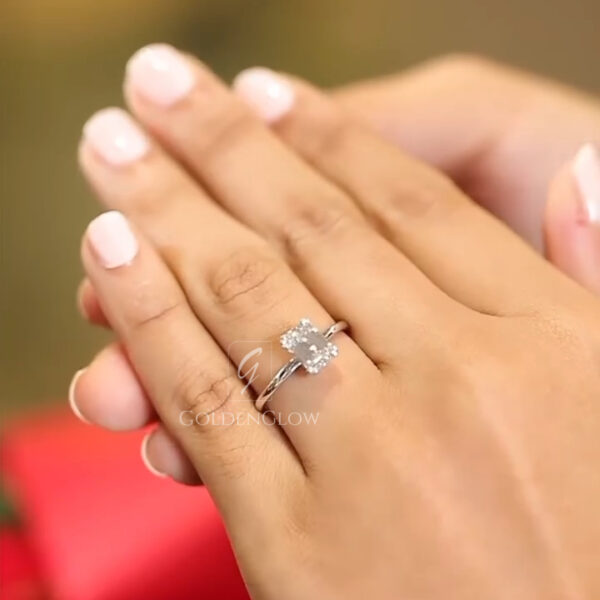 • A close-up of a solitaire engagement ring resting on a fresh green leaf. The ring features an oval cut moissanite or Moissanite diamond set in a yellow-gold band with fine detailing along the shoulders. The gemstone sparkles naturally in soft daylight, highlighting its clarity and brilliance. The textured green leaf background creates a fresh, organic contrast that emphasizes the elegance and timeless design of the ring.A close-up of two solitaire engagement rings held between fingers, each featuring a round cut moissanite or Moissanite diamond. One ring is set in yellow gold and the other in white gold, both designed with classic prong settings and elegant shoulder detailing. The gemstones sparkle brightly in natural sunlight, highlighting their brilliance and clarity. A softly blurred green background creates a fresh, natural contrast that emphasizes the refined craftsmanship and timeless beauty of the rings.