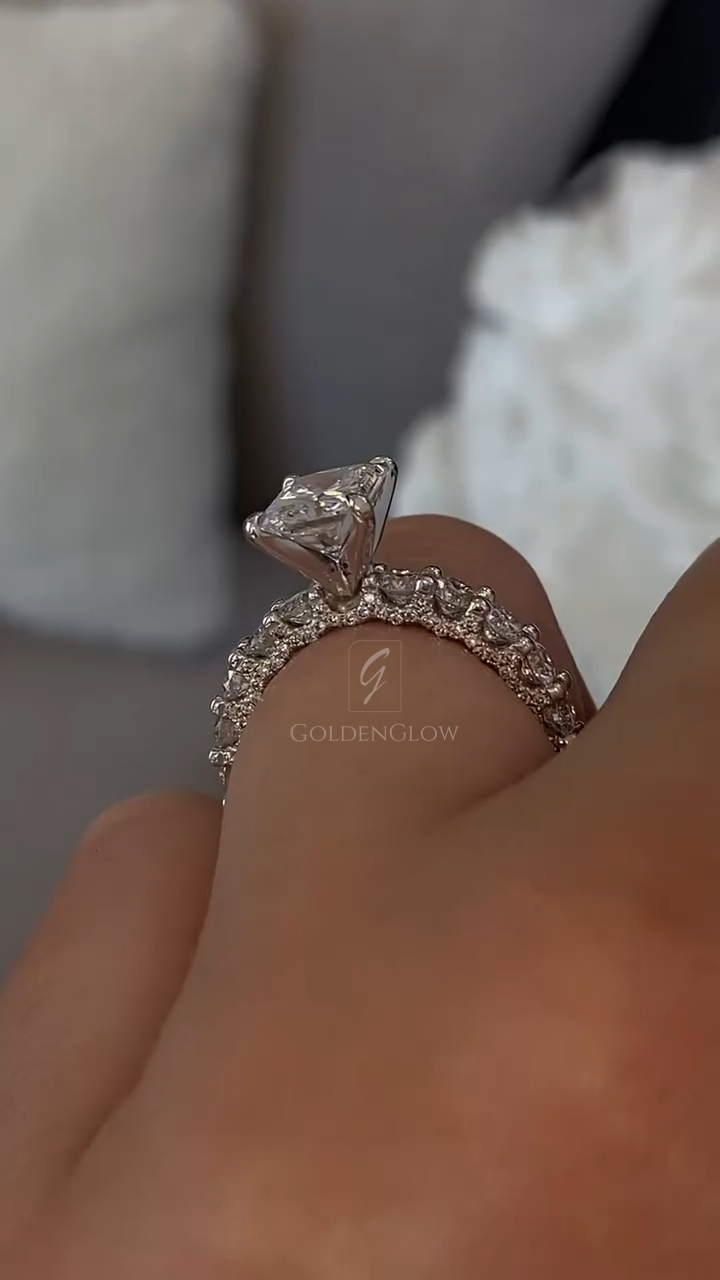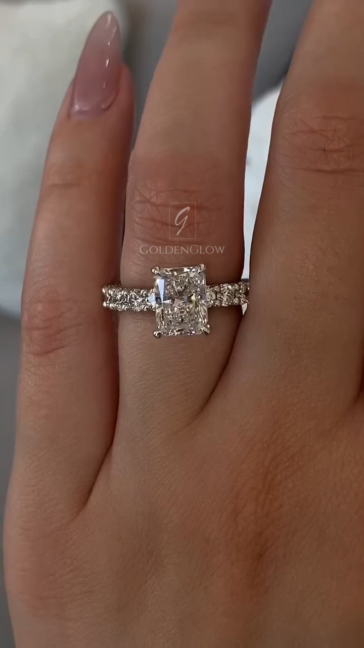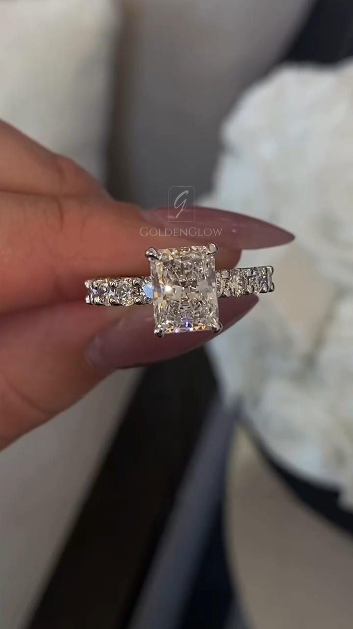Indulge in luxury with a 3 Ct Moissanite / CZ Radiant diamond ring. Handcrafted in 925 silver or 10K, 14K gold.