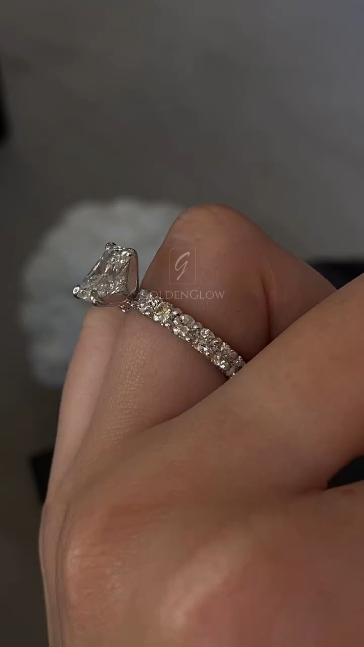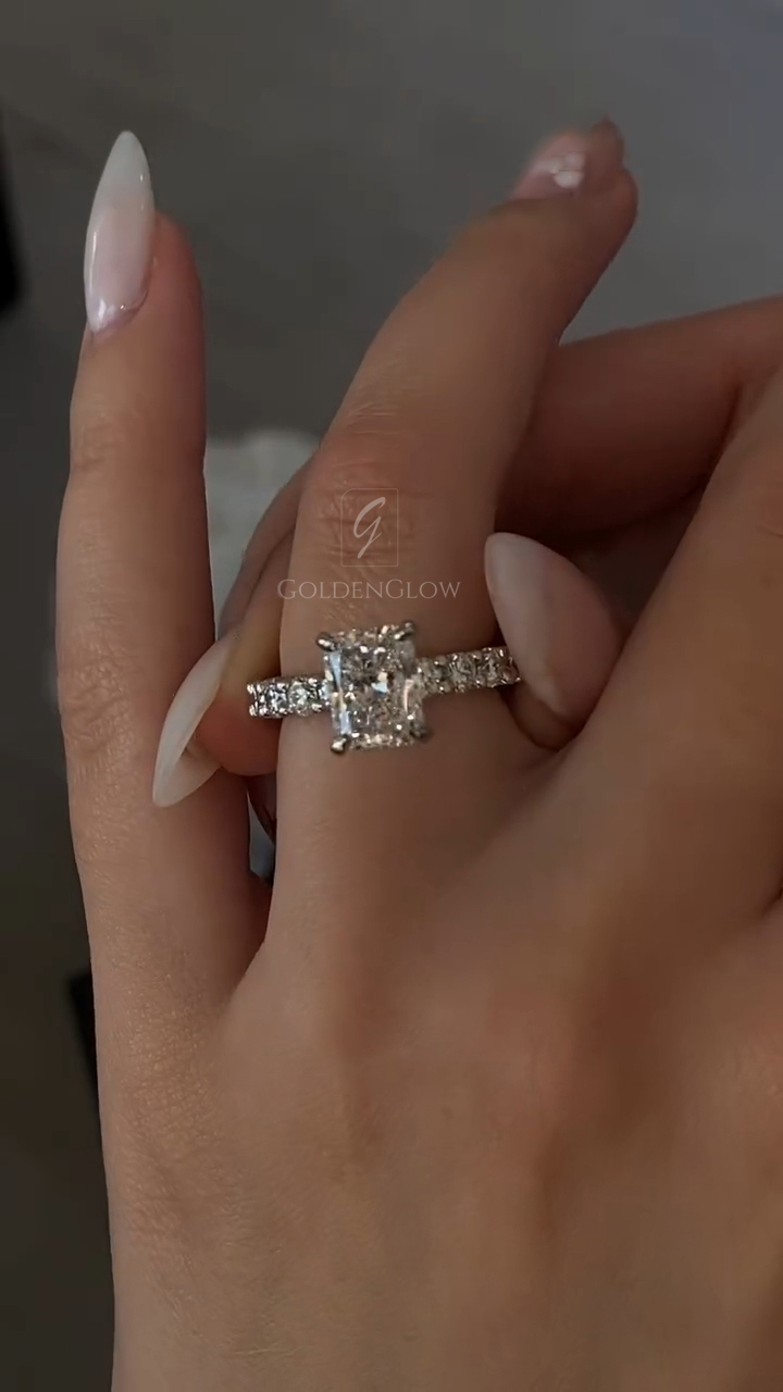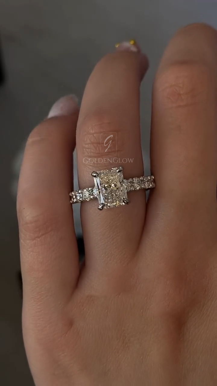Indulge in luxury with a Moissanite / CZ Radiant diamond ring. Handcrafted in 925 silver or 10K, 14K, 18K gold.